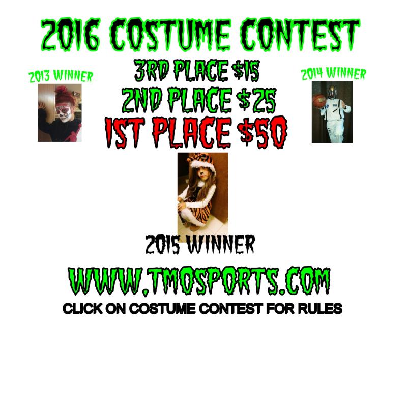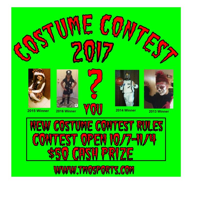 3. All eligible photos wil be posted on our facebook page "TMOSPORTS", the photo with the most likes on our TMOSPORTS facebook page win. You can also go to www.tmosports.com and click on "costume contest" tab to view current leader board through out the contest.